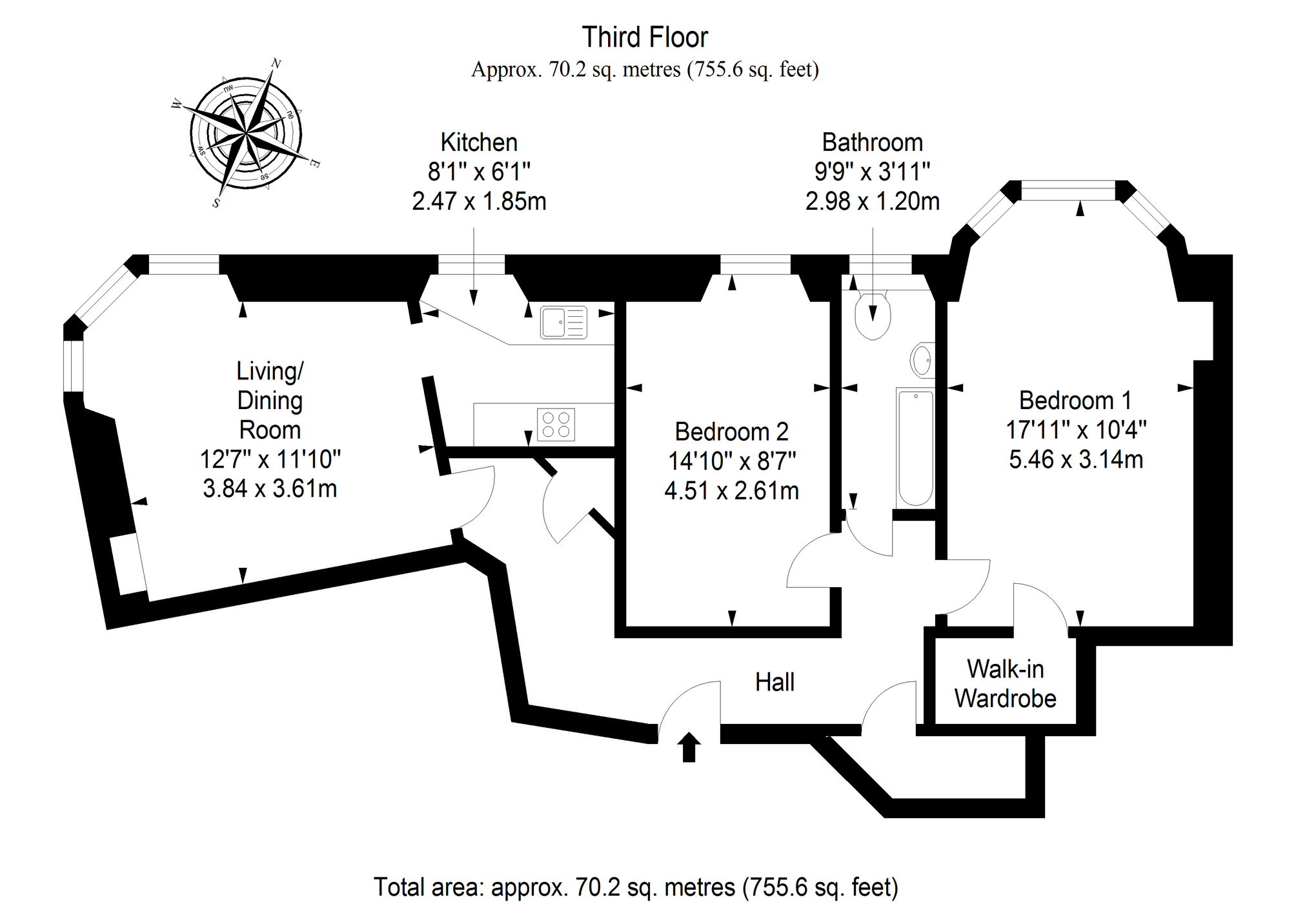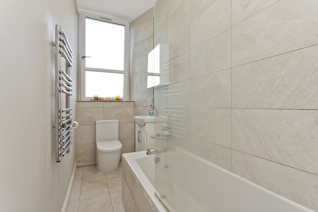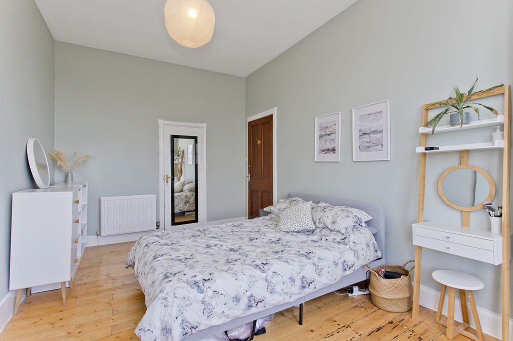 Meanwhile, the two double bedrooms have similar styling to the living area, enjoying varnished wooden floorboards and light neutral hues. Whilst the principal bedroom has the larger footprint with a bay window and a walk-in wardrobe, both rooms have ample floorspace for bedside furnishings.