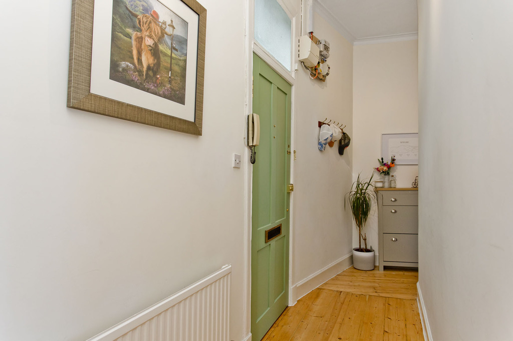 Accessed via a secure entry system and shared stairwell, the flat’s front door opens into a central hall with built-in storage.