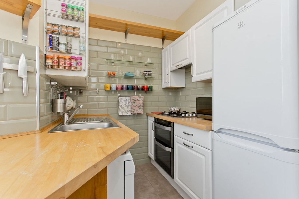 An open doorway leads through to the adjacent kitchen, which has an on-trend design. It pairs white cabinets with wood-toned worktops and fashionable metro-style splashbacks. It also comes with an integrated oven/grill and gas hob, as well as a freestanding fridge/freezer, and a washing machine.
