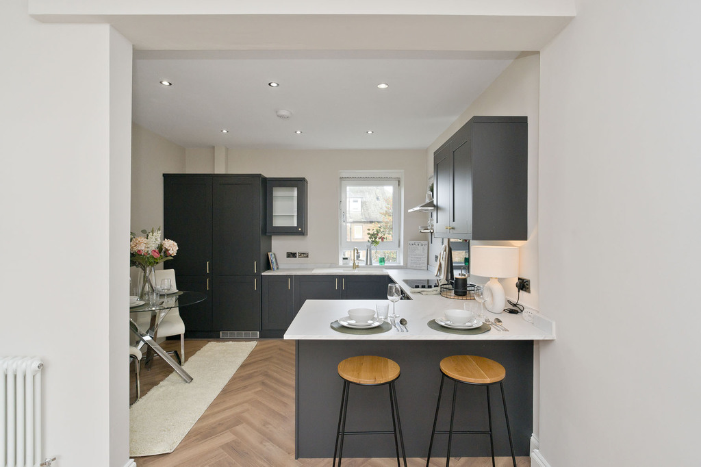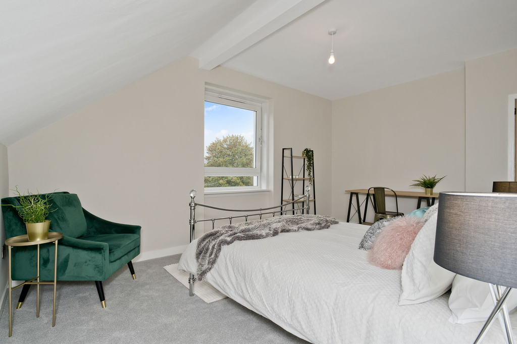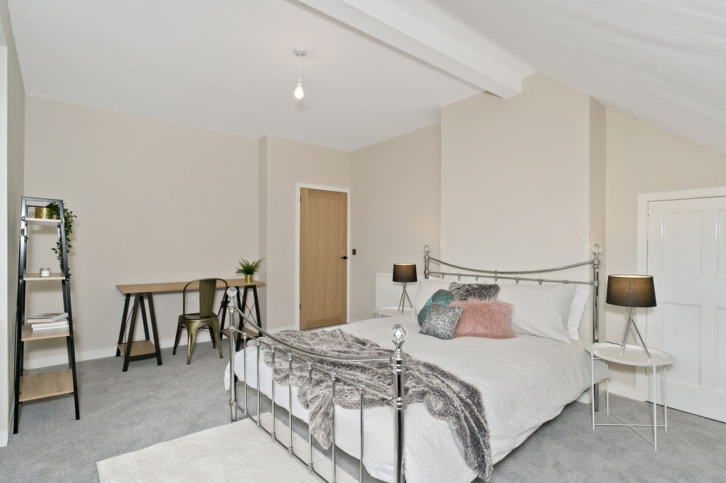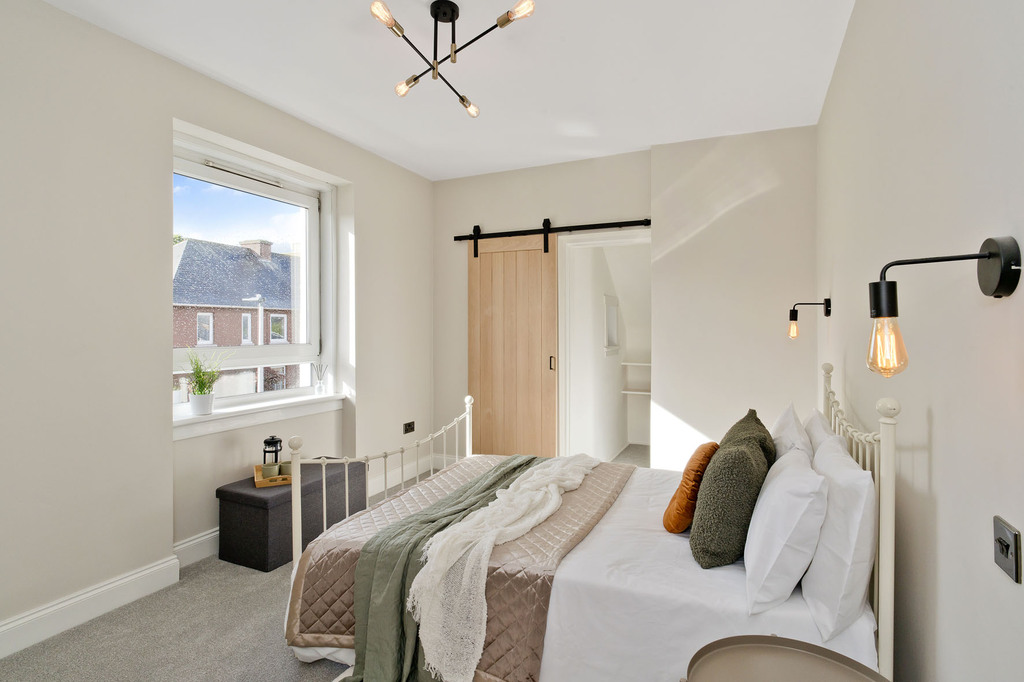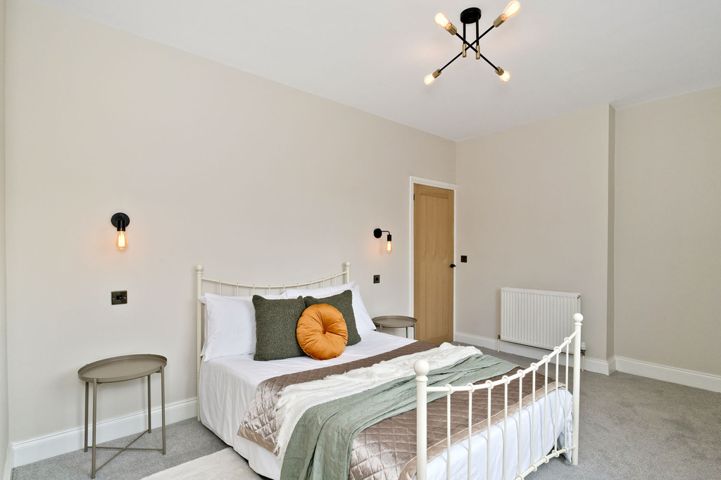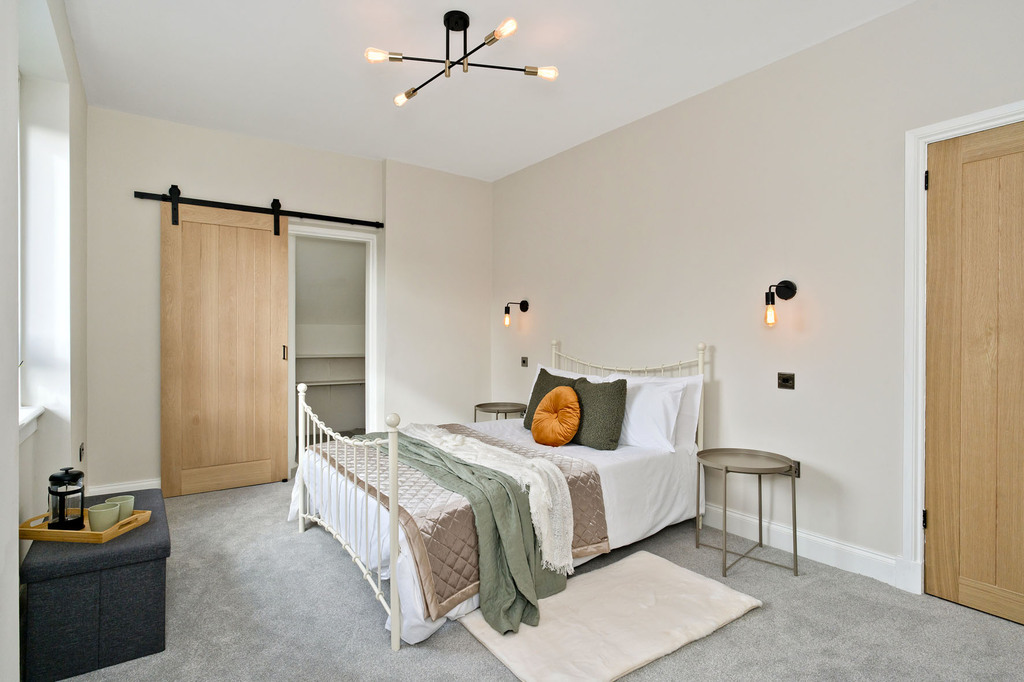 Two bright double bedrooms providing floorspace for bedside furnishings, relaxed seating, and a study/vanity desk. Both bedrooms are finished in modern hues and with plush carpets, continuing the high standards. The dual-aspect principal bedroom also features a built-in cupboard, whereas the second bedroom has a built-in store hidden behind a sliding wooden door that adds to the room’s attractive aesthetic.