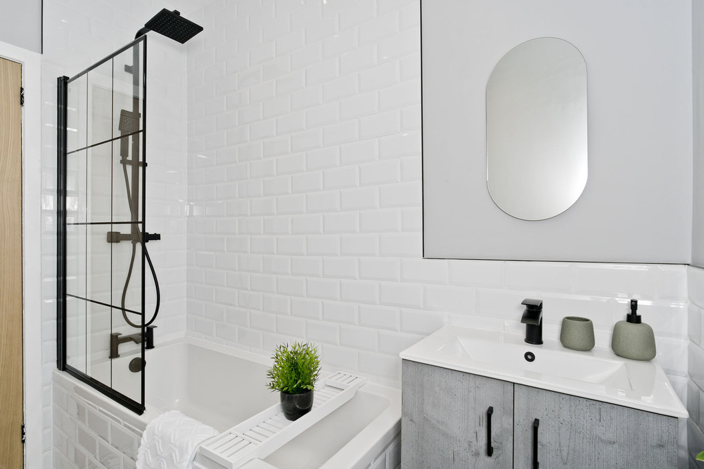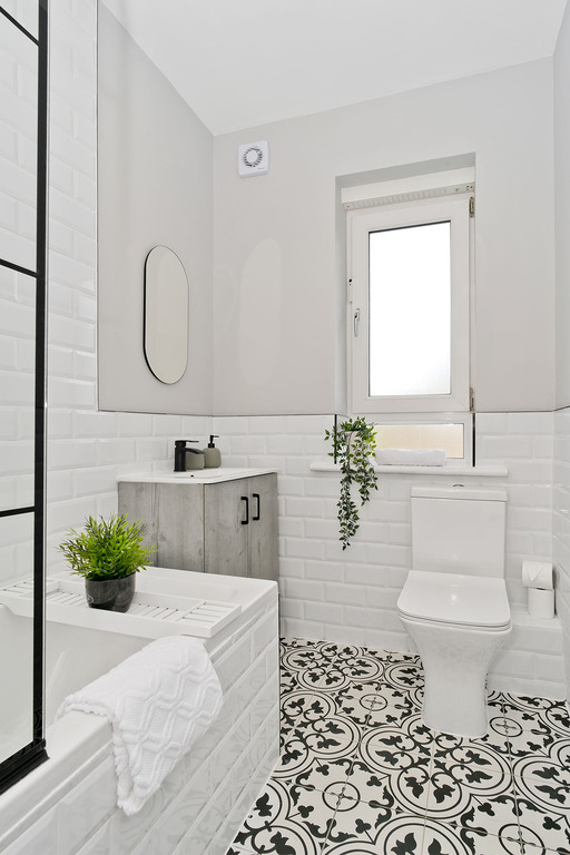 The bathroom has an on-trend style and a quality three-piece suite with overhead rainfall shower and bath.