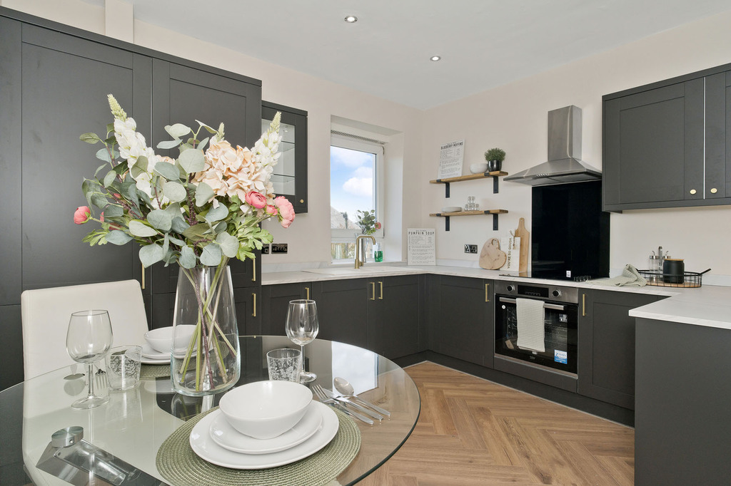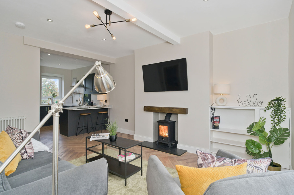 Light-filled living room has neutral décor paired with a herringbone floor. A cosy log-burning stove sits below a wooden mantelpiece and alongside fitted shelving for display items. An open archway leads through to the dining kitchen, which has a stylish Shaker-inspired design and a fitted breakfast peninsula. It offers generous storage as well as room for family dining. The integrated oven, ceramic hob, fridge/freezer, and washing machine benefit the streamlined finish.