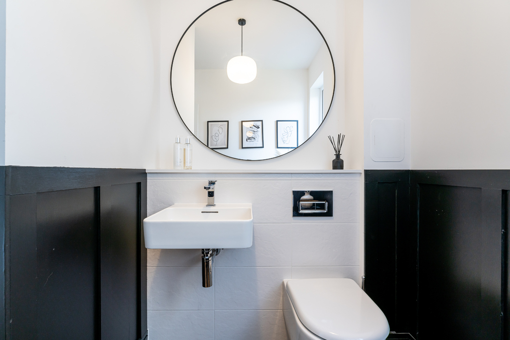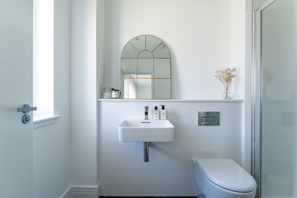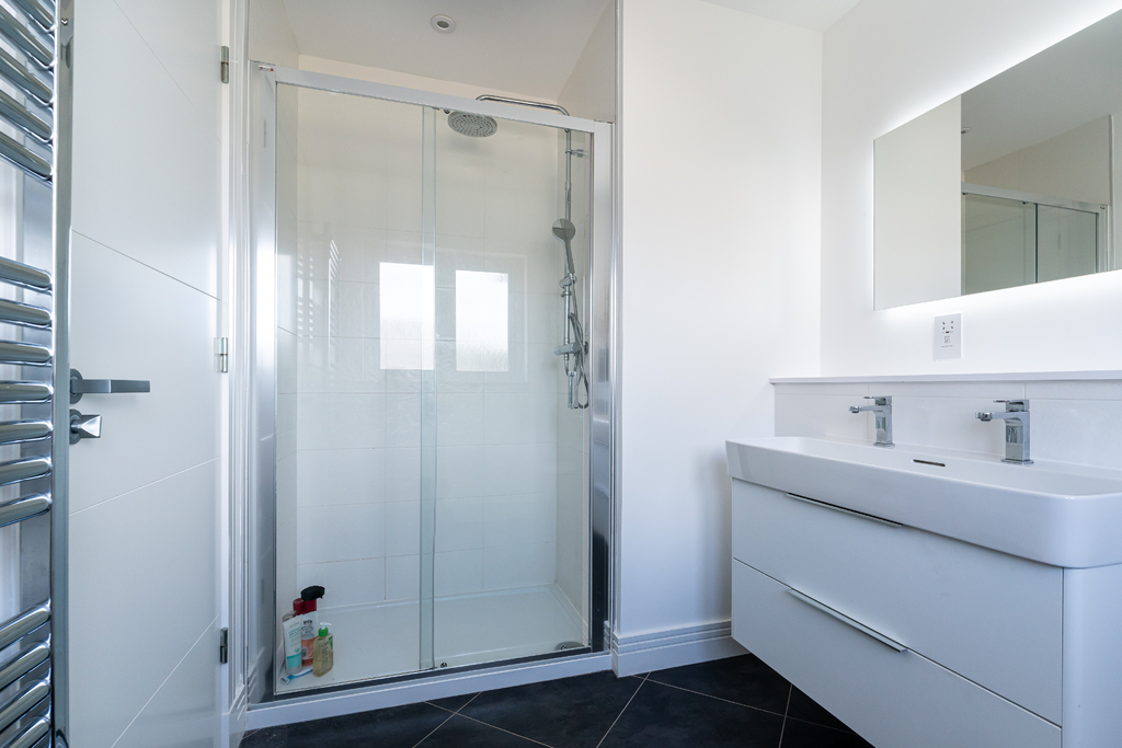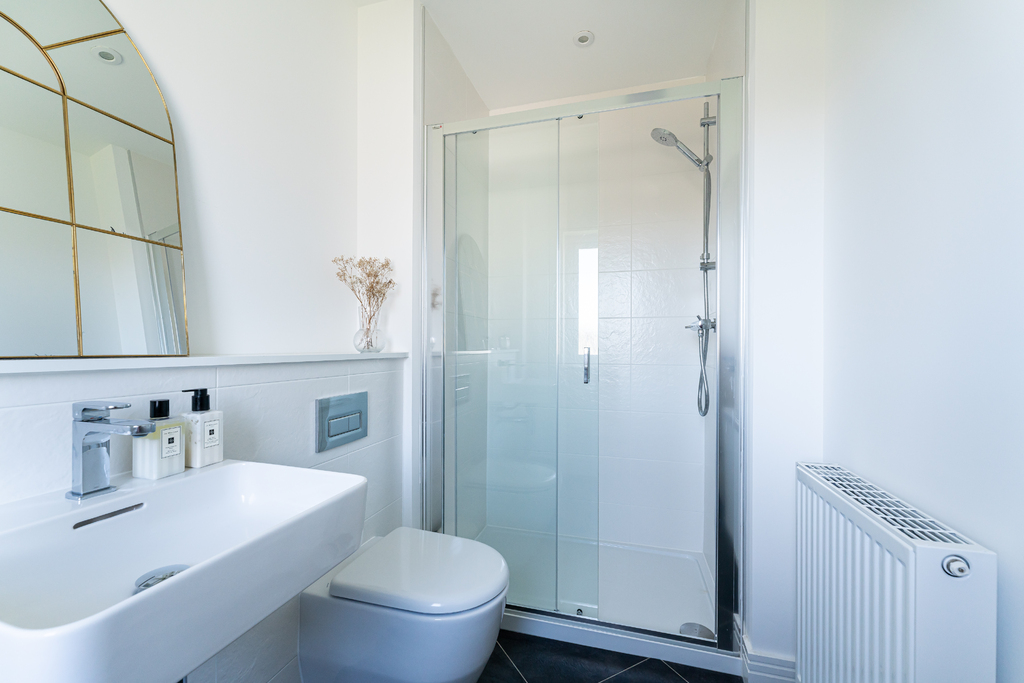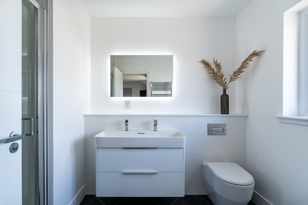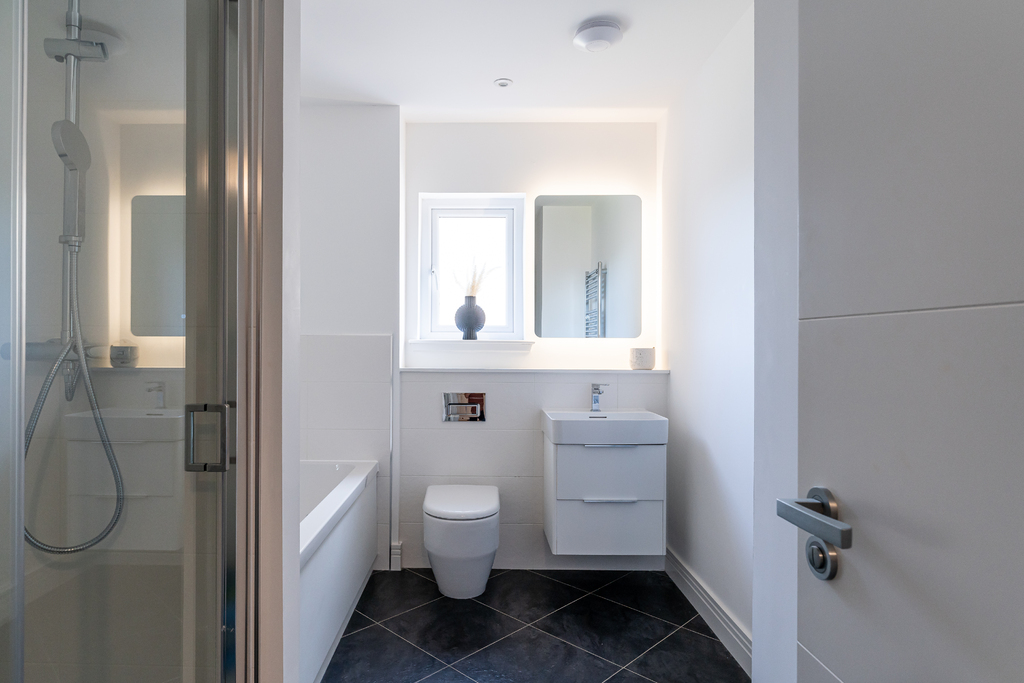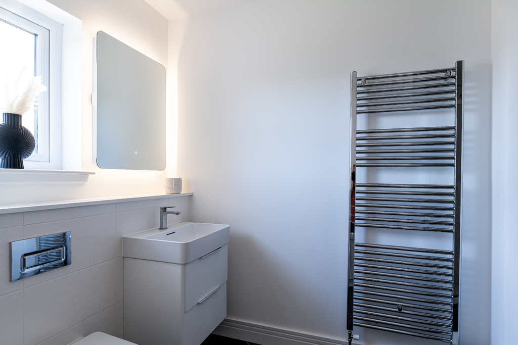 The Family Bathroom has a chrome towel radiator, LED mirror, hidden cistern WC, washbasin built into wall-hung vanity, bath and a separate shower enclosure.