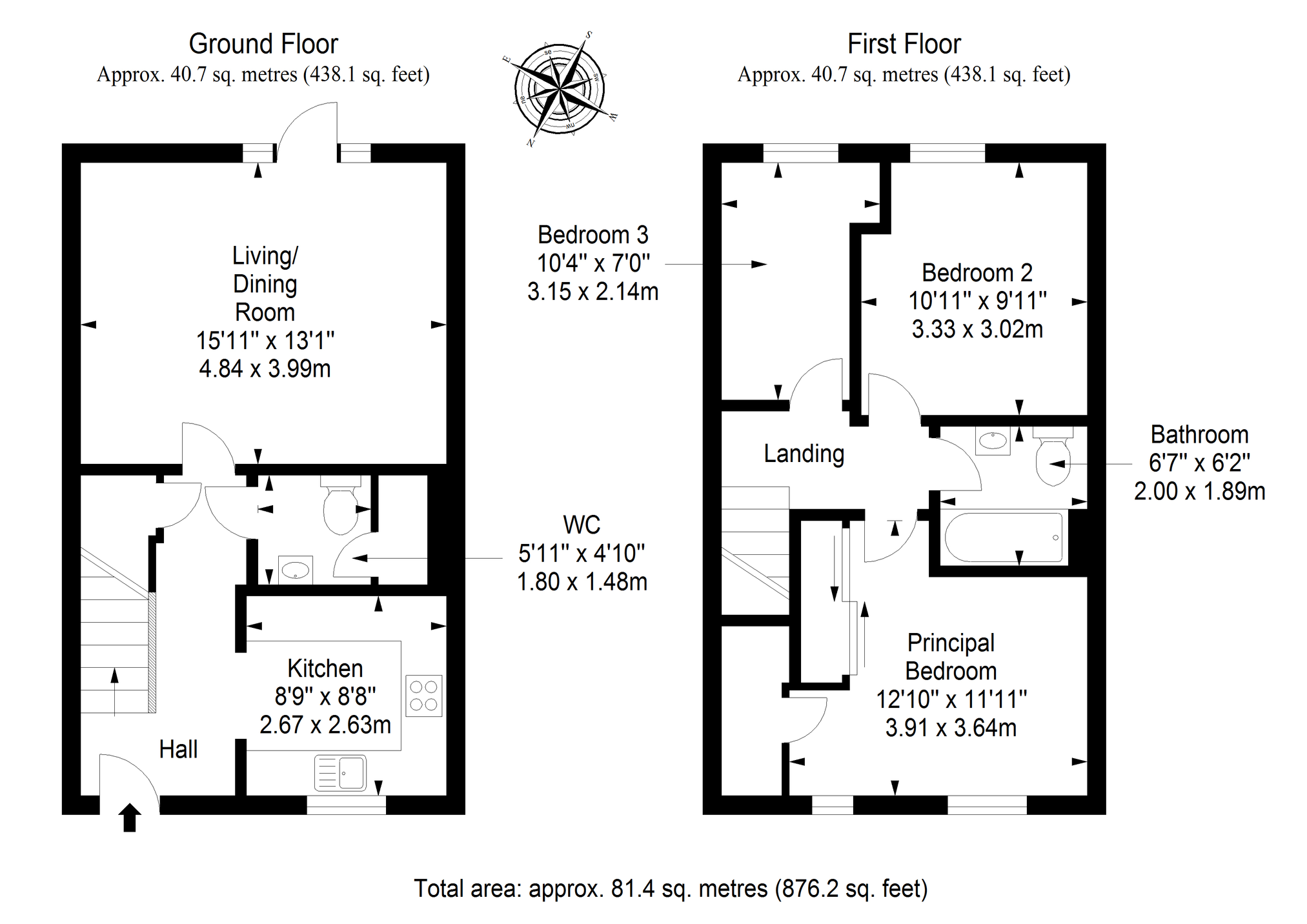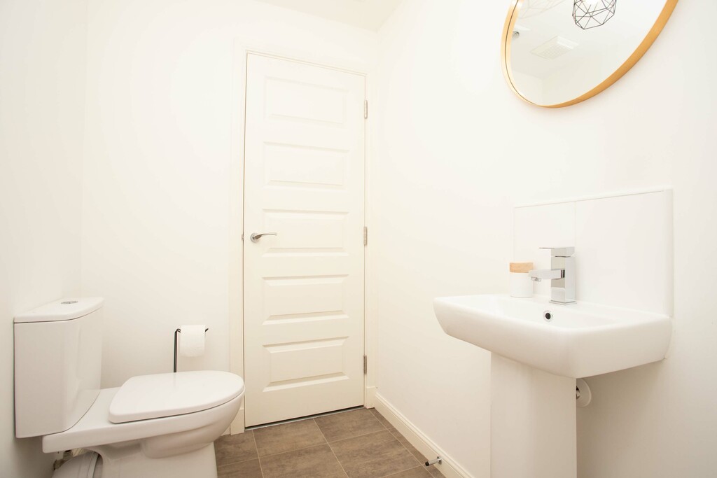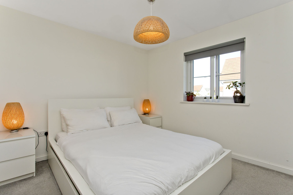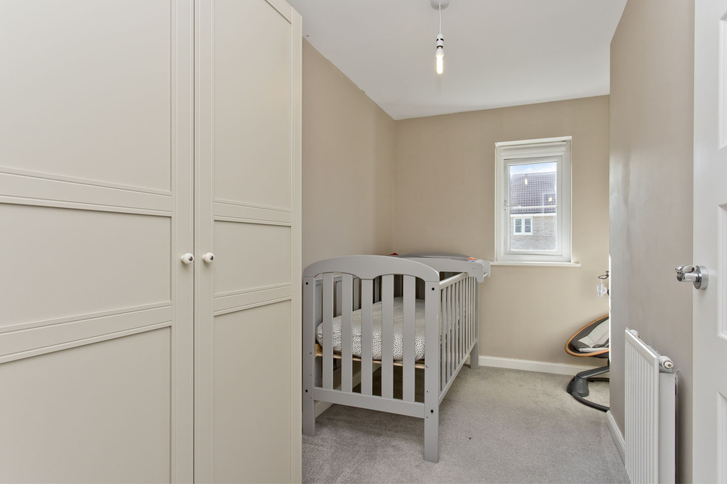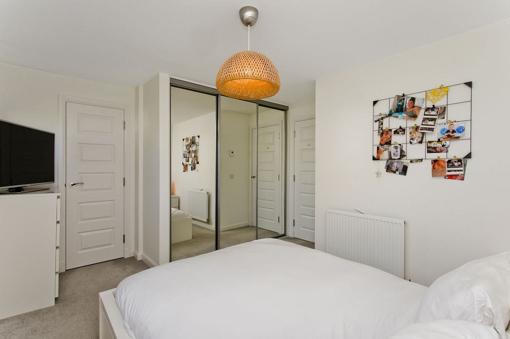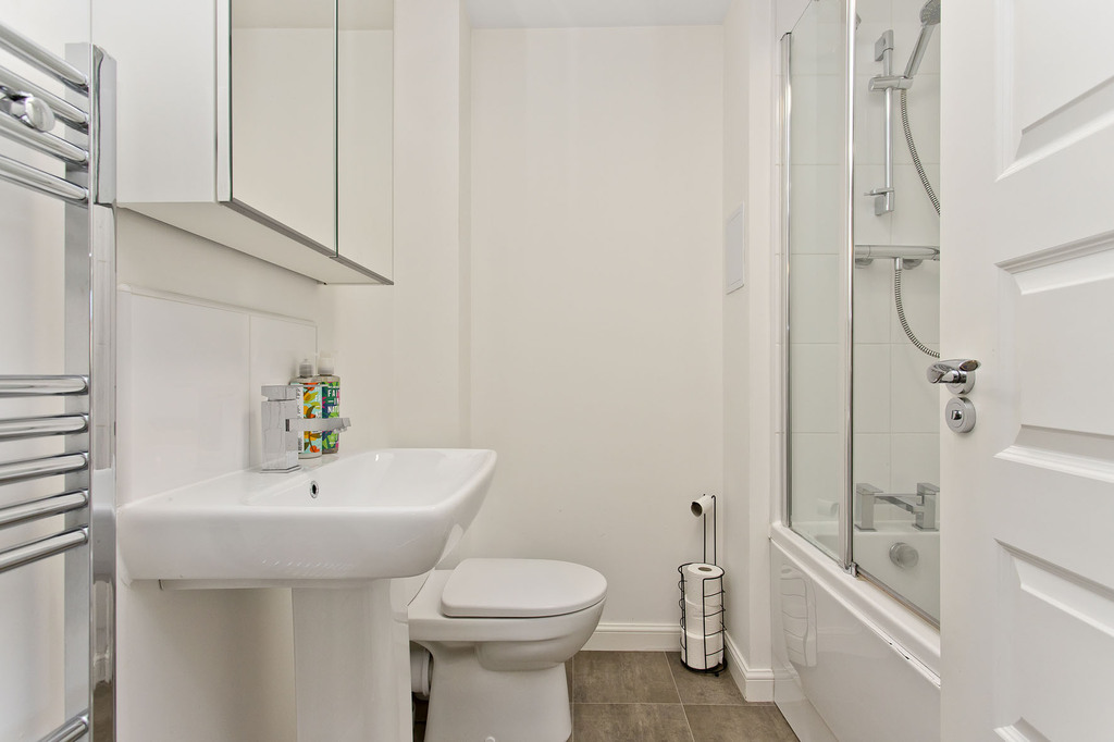 On the first floor, a landing leads to three bedrooms, all enjoying tastefully toned décor and fitted carpeting for extra comfort. The principal bedroom is supplemented by a wealth of incorporated storage, with a large, mirrored wardrobe and a storage cupboard. The second double and the single room pleasantly overlook the rear garden.