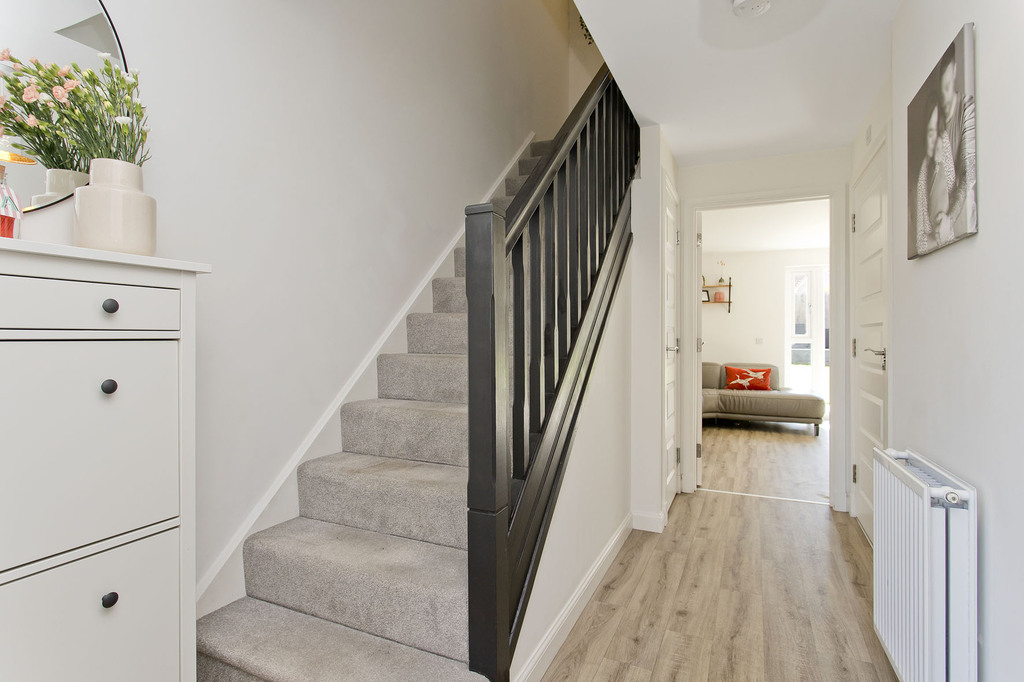 On opening the front door, you step into an airy hallway decorated in crisp white with a handsome oak-inspired floor – a chic finish that continues throughout the ground floor. This inviting entrance area, housing a WC and built-in storage, affords access to the reception room and kitchen.